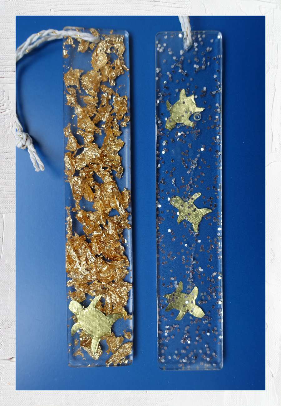 Zwei Lesezeichen, Unikate, Schildkrötchen auf Goldfolie vorgezeichnet und ausgeschnitten, flüssiges Epoxidharz in Silikonform gegossen, 24 Stunden getrocknet, Format je 14 x 2,7 cm. Links wurde Blattgold mit der Pinzette eingelegt, rechts Glitzer eingestreut.