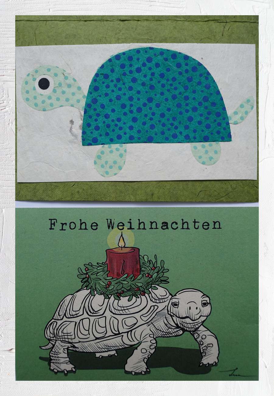 Obige Doppelkarte ist eine handgemachte Collage aus Nepal, in mehreren Lagen, auf Büttenpapier. Inzwischen gibt es zusätzlich eine Variante mit eingelegtem Brieflein von Reinhard und Cornelia, u.a. soll die Schildkröte die allerbesten Wünsche überbringen, mit dem witzigen Zusatz "PS. Ich würde gerne bei ihm wohnen. Ist das vielleicht möglich? (Ich bin pflegeleicht)". Die Weihnachtskarte von "lisa.malt@gmx.net wurde auf Zuckerrohrpapier gedruckt. Format jeweils DIN A 6 .