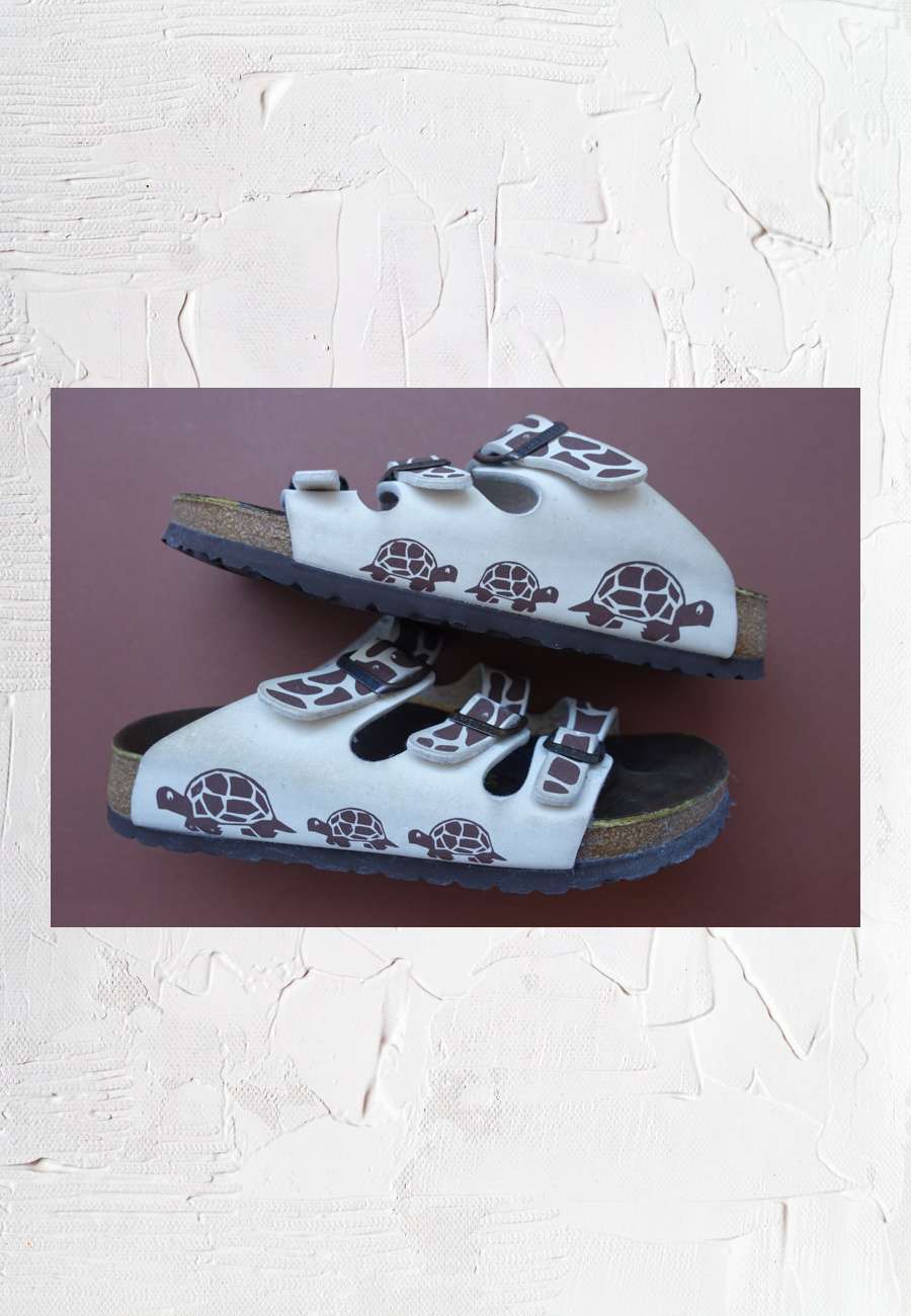 Sandalen mit anatomisch geformten Fußbett und Profilsohle, Brandsohle Leder, die Riemen sind innen gefilzt. Das jeweils rückseitige Design orientiert sich an der Struktur von Schildkröten-Panzern, Modell "Papillio" von Birkenstock. Die Firma ist seit den 1970er Jahren Global Player, Werbeprosa "Gönne deinen Füßen jeden Tag ein Stück Urlaub!"