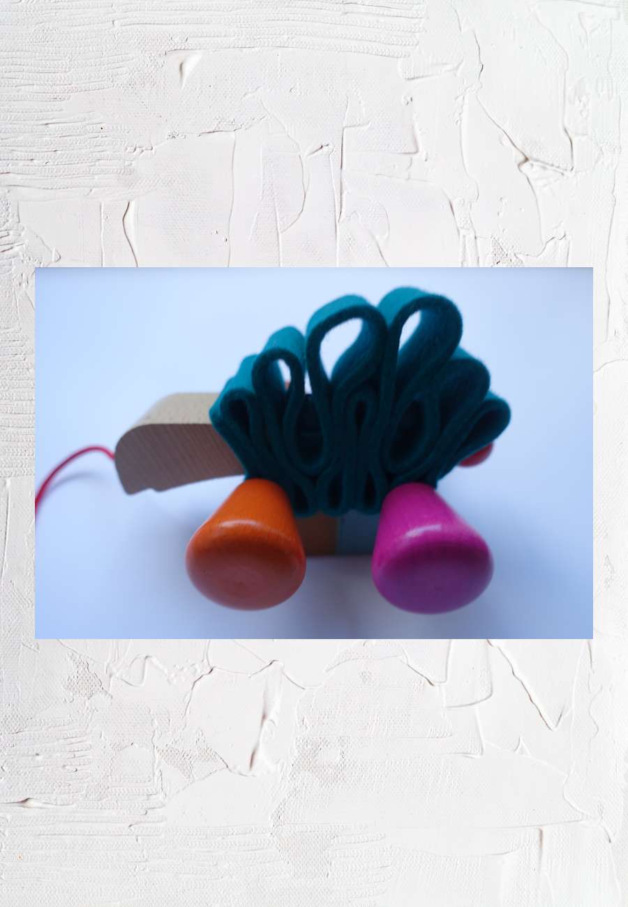 "Kringelflitz", die Schilkröte zum Nachziehen, originelles Design, mit weichem Filzkörper (dazwischen 3 farbige Holzkugeln), Augen aufgemalt, Alter: ab 1 Jahr, TÜV geprüft, Fa. Selecta (Edling), Made in Germany, Länge 14 cm.
