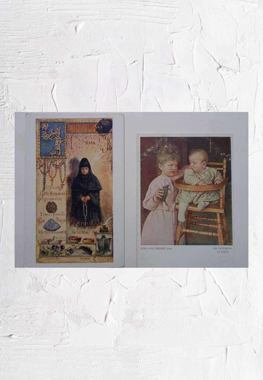 Links: Motiv der russischen Künstlerin deutscher Abstammung, Titel "Die Nonne", aus der Serie zu den Buchstaben von A - Z, aus den Jahren um 1900. Rechts: Gemälde des österreichischen Porträt- und Historienmalers (Akademie der Bildenden Künste Wien, München und Paris), Titel "Die Schildkröte", um 1898. Der Künstler Tom v. Dreger (1868 - 1948) avancierte zum bevorzugten Porträtisten des österreichischen Kaiserhauses.
