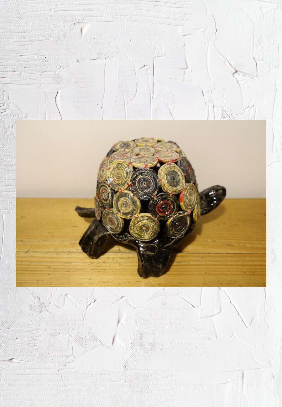Der Unterbau ist getöpfert, glasiert und sign., Länge 25 cm. Der zugefügte Panzer ist eigentlich ein kunsthandwerkliches Körbchen aus 40 Scheiben, bestehend aus starken, eng gewickelten Papierröllchen, lackiert und zusammengenäht, Gesamthöhe 14 cm.