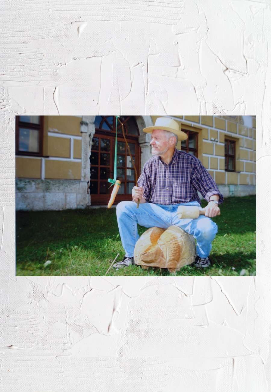 Das Bild mit einer noch nicht ganz fertiggestellten eigenen Arbeit wurde von meinem Freund Hermann Bigelmayr aufgenommen, der den Bildhauer-Workshop in Freihalden geleitet hat. Das abgeschlossene Werk lässt sich unter "Skulpturen" finden. Eine derartige Präsentation mit Schildkröte (wie hier) gibt es noch in anderen Varianten, s. Postkarten (Walter Rothschild, Anita Jeram) oder Sammelkarten (Rudolf Presber).