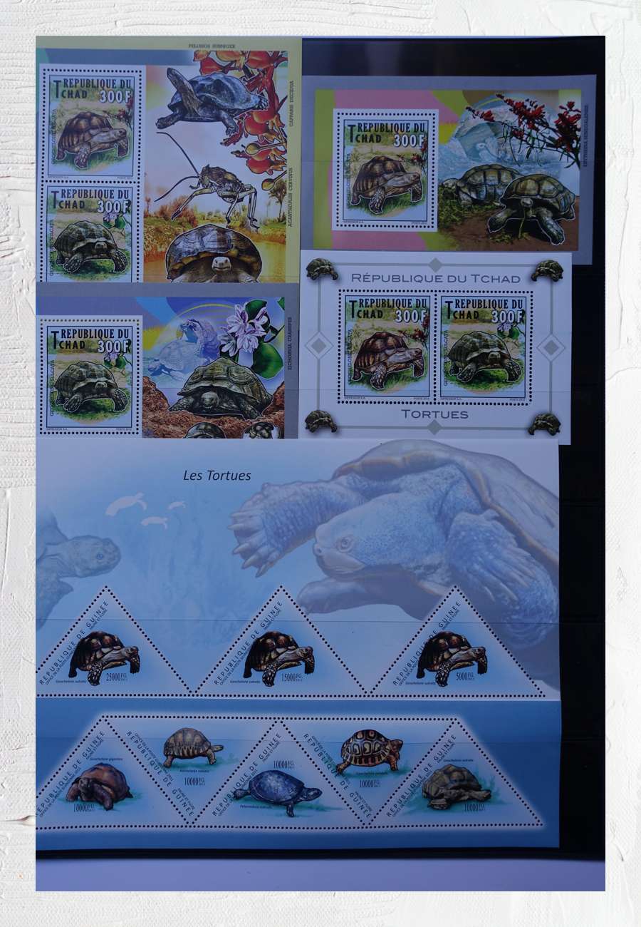 Briefmarken aus Tschad (4 Blöcke mit sich wiederholenden Motiven) und Guinea, hier ist die Gestaltung abwechslungsreicher.
