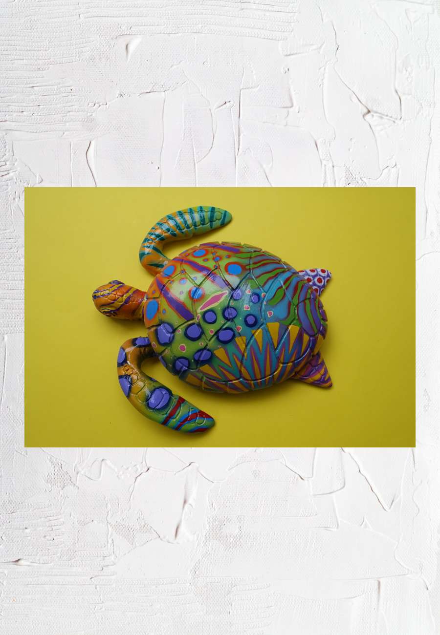 Fiberglas (Glasfaserverstärkter Kunststoff), Unikat, da farbenfroh per Hand bemalt, mit Kunstharz versiegelt und fair hergestellt, Größe 22 cm.
