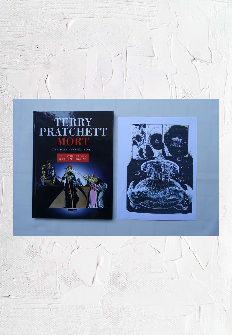 Der britische Fantasy-Schriftsteller T. Pratchett (1948 - 2015) wurde u.a. durch seine 41 "Scheibenwelt-Romane" berühmt. Als Schauplatz der Geschichten gilt die flache Scheibenwelt, die von 4 Elefanten getragen wird, die auf dem Panzer einer riesigen Meeresschildkröte (namens Great A`Tuin) stehen. Zitat: "Diskworld is the fantasy world, yeah, yeah, which goes throug space on the back of a gigant turtle". Dazu gehören die Illustrationen von Graham Higgins. Das Motiv wurde vom altindischen Weltbild abgeleitet (Quelle: Buch von Alexander Lauterwasser "Das Geheimnis der Schildkröte", Seite 94 - 97). Auch die alten