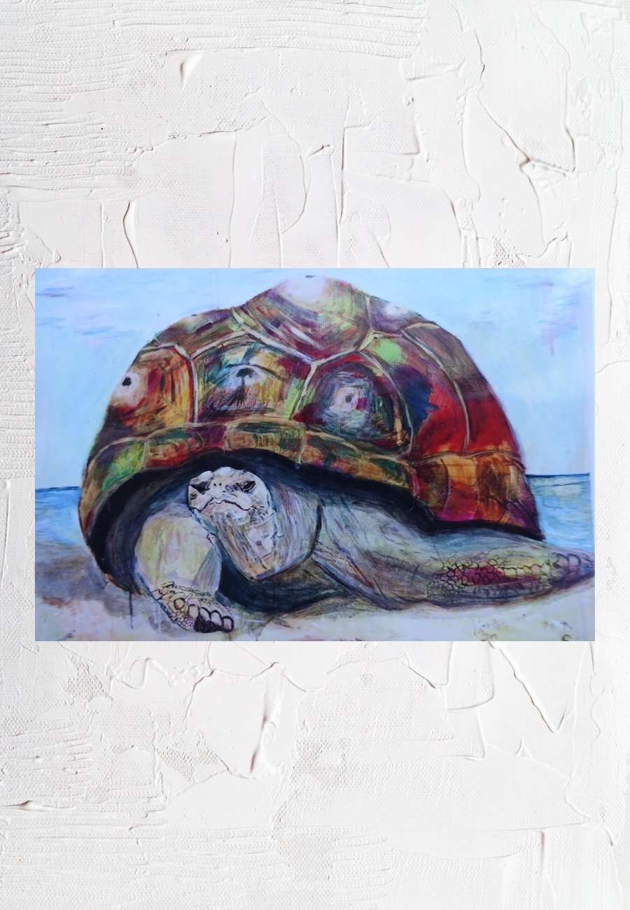 Das Gemälde (Acryl) mit dem Titel "Lebensweisheit" war bei einer Ausstellung zu sehen. Es ist das Lieblingsbild der autoditaktischen Künstlerin (Malerei ist ihr zweites Standbein, Schwerpunkt sind u.a. Krafttiere) und deshalb nicht verkäuflich. Da ich aber recht interessiert war, hat sie extra für mich einen guten Kunstdruck (selbst die Struktur der Leinwand ist wahrnehmbar) veranlasst und signiert, Format 60 x 80 cm. Die sehr differenzierten Farben des Panzers stehen laut ihrer Aussage "für die unterschiedlichsten Lebenserfahrungen, das Motiv ist zugleich Symbol für Weisheit, Geduld und langsamen, aber stetigen Fortschritt. Das Bild kam beim "schamanischen reisen zu ihr und wollte gemalt werden" (mein Verweis: Katalog des Museum Schloß Moyland "Joseph Beuys und die Schamanen", u.a. mit dem Künstler Anatol Donkan / Ethnie der Nanai). Sie ist ursprünglich Dipl.Betriebswirtin, inzwischen mit eigener Praxis für Physiotherapie und Coaching in Königstein/Taunus). Zusätzlich stellte sie mir ihren sechsseitigen Text "Lucy und der Rhythmus des Lebens" zur Verfügung, in dem eine große Schildkröte eine wichtige Rolle spielt.