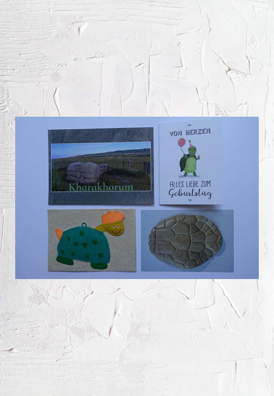 Ein kleines Sammelsurium, links oben: das Foto dieses Wahrzeichens aus der alten Hauptstadt hat Harry Merzenich 2024 bei einer Reise durch die Mongolai für mich gemacht. Zu dieser großen Skulptur aus der Zeit Dschingis Khans (Begründer eines gewaltigen Reiches, ca. 1.220 nach Chr.) gibt es auch eine Postkarte, mit 3 abgestempelten Sondermarken der Mongolai von 1981, damals war die Öffnung im Panzer noch mit Reststeinen einer Stele gefüllt. Daneben: Doppelkarte mit einem Motiv von Mel Armstrong und Glückwünschen von Elke Wallrapp aus Bad Homburg. Links unten: neutrale Doppelkarte und zugleich ein kleines Geschenk. Die Schildkröte aus Blech ist handbemalt und kommt aus München. Sie lässt sich leicht ablösen und aufhängen. Daneben: eigenes Foto ein Skulptur von Maria Rucker, Titel "Hydra", Kalkstein, Größe 36 x 26 cm (s. auch meine Arbeit von dieser Künstlerin).