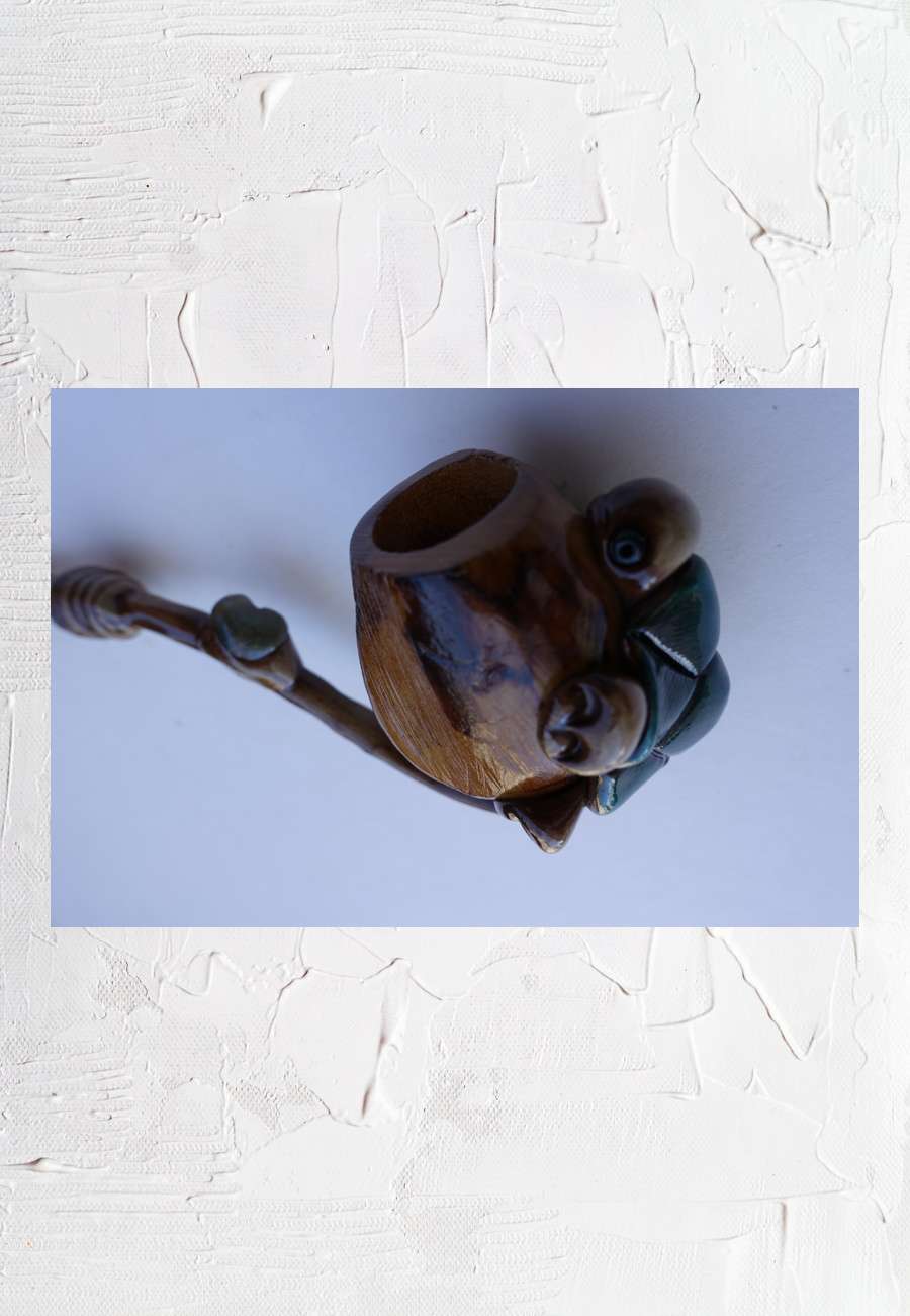 Tabakpfeife aus Ecuador, der Pfeifenkopf besteht aus einer harten, nußartigen Frucht mit kleinem Metallsieb, der handliche Stil (mit einem Ziersteinchen) aus Holz, mit aufgesetzter Schildkröte, lackiert, Größe 14 cm.