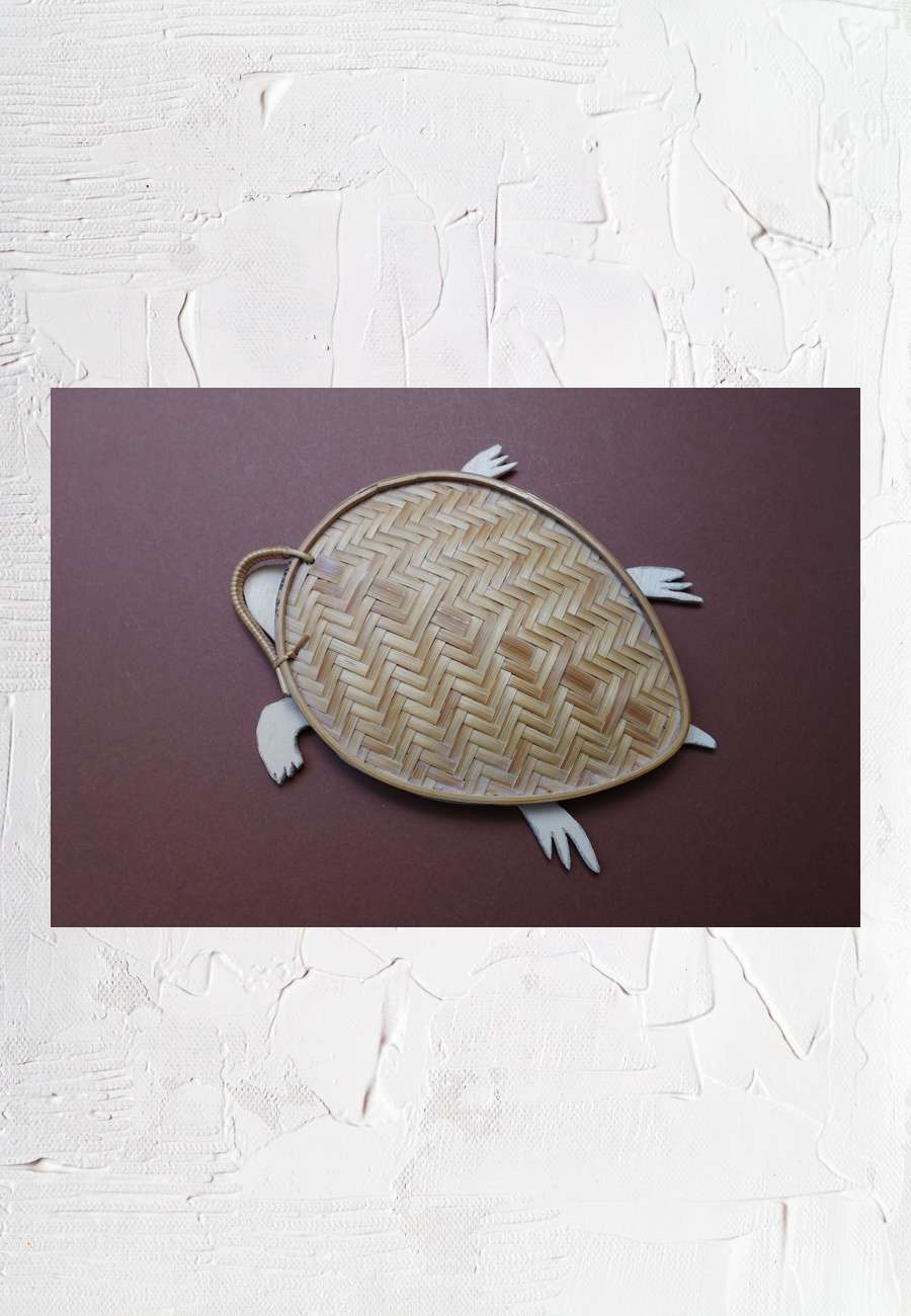Die Basis wurde aus Sperrholz ausgesägt und mit einer sorgfältig gefassten Flechtarbeit - ein Fund vom Flohmarkt - kombiniert. Evtl. handelt es sich um den Deckel eines Körbchens, die Schlaufe (Griff ?) bot sich als Kopf an, Größe 18 cm.
