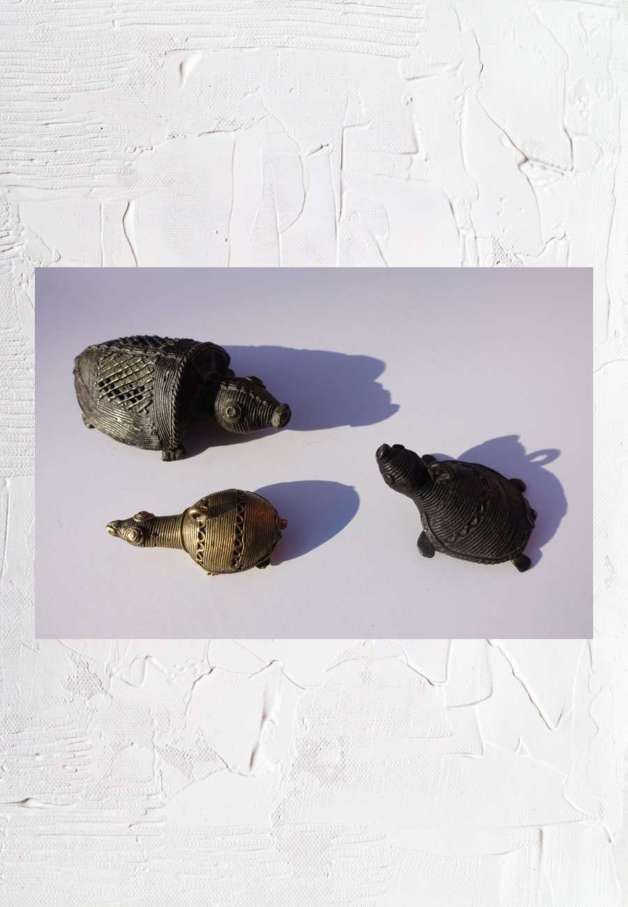 Drei handwerklich solide Werke, Bronze- bzw. Messingguss, aus Nepal, die beiden kleineren sind als Anhänger tragbar, Größe zwischen 6 und 10 cm. Der Panzer (links oben) ist teilweise gitterartig durchbrochen und im Boden ist ein ovales Loch vorgesehen, dies deutet auf eine Verwendung als Räucherwerk hin.