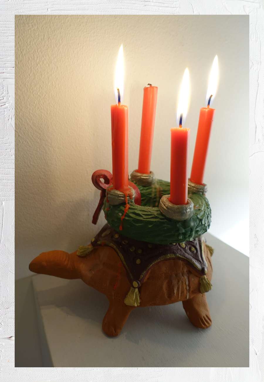Für mich ein besonders origineller Gebrauchsgegenstand (Unikat). Die handgetöpferte Schildkröte (Ziegelton, unglasiert) trägt auf einer Decke mit sechs Quasten einen traditionellen Adventskranz (glasiert), Länge 18 cm, Höhe 12 cm (ohne Kerzen). In der gleichen Technik gibt es noch zwei unterschiedliche Schildkrötchen mit blauer Decke und vier Quasten als Kerzenhalter, Größe 8 und 9 cm. Die Keramikerin mit Atelier in Triftern (Niederbayern) bezeichnet sich auch als Figurendesignerin und modelliert u.a. Firstgockel und anderes Getier. Sie war außerdem länger auf dem Schwabinger Weihnachtsmarkt vertreten.