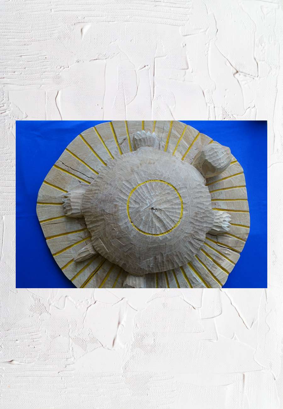 Dieses Werk entstand beim Bildhauer-Workshop (2007) von Hermann Bigelmayr, in dessen Atelier mit großem Freigelände in Freihalden, Titel: "Kosmische Schildkröte". Herausgearbeitet aus dem großen Stamm einer Pappel (Durchmesser ca. 72 cm, Stärke ca. 14 cm, sign.). Kopf und Schwanz sind freigelegt, der Boden ausgehöhlt. Der eingekerbte Strahlenkranz, zurückhaltend eingefärbt, symbolisiert zugleich die Sonnenscheibe. Auf die Idee, die Strahlen per Auftrag vergolden zu lassen, wurde zu Gunsten der Originalfassung verzichtet.