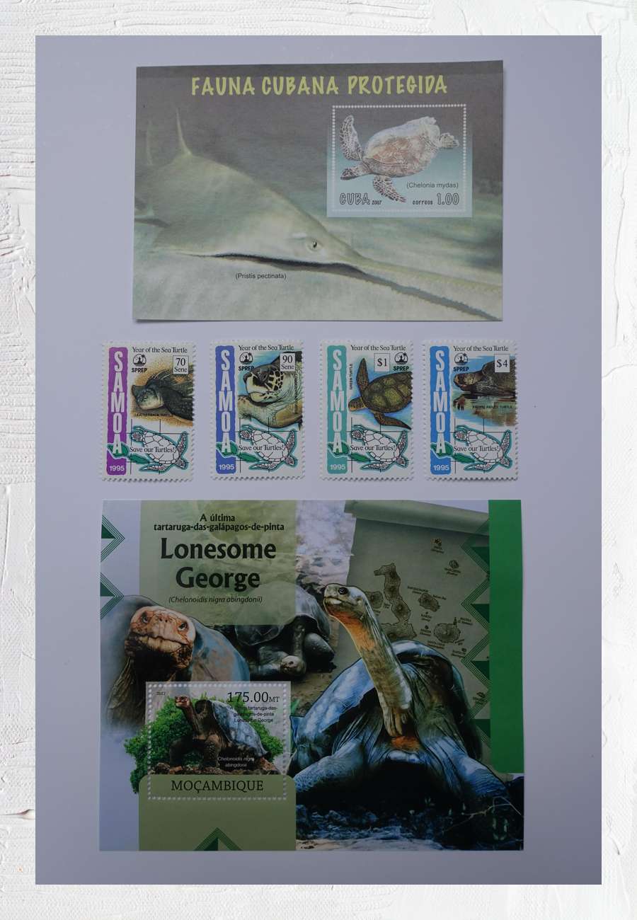 Zwei Blöcke aus Cuba (Geschützte cubanische Fauna) und Mosambik (mit Lonesome George von der Galapagos-Insel Pinta), sowie ein Satz mit Meeresschildkröten aus Samoa.