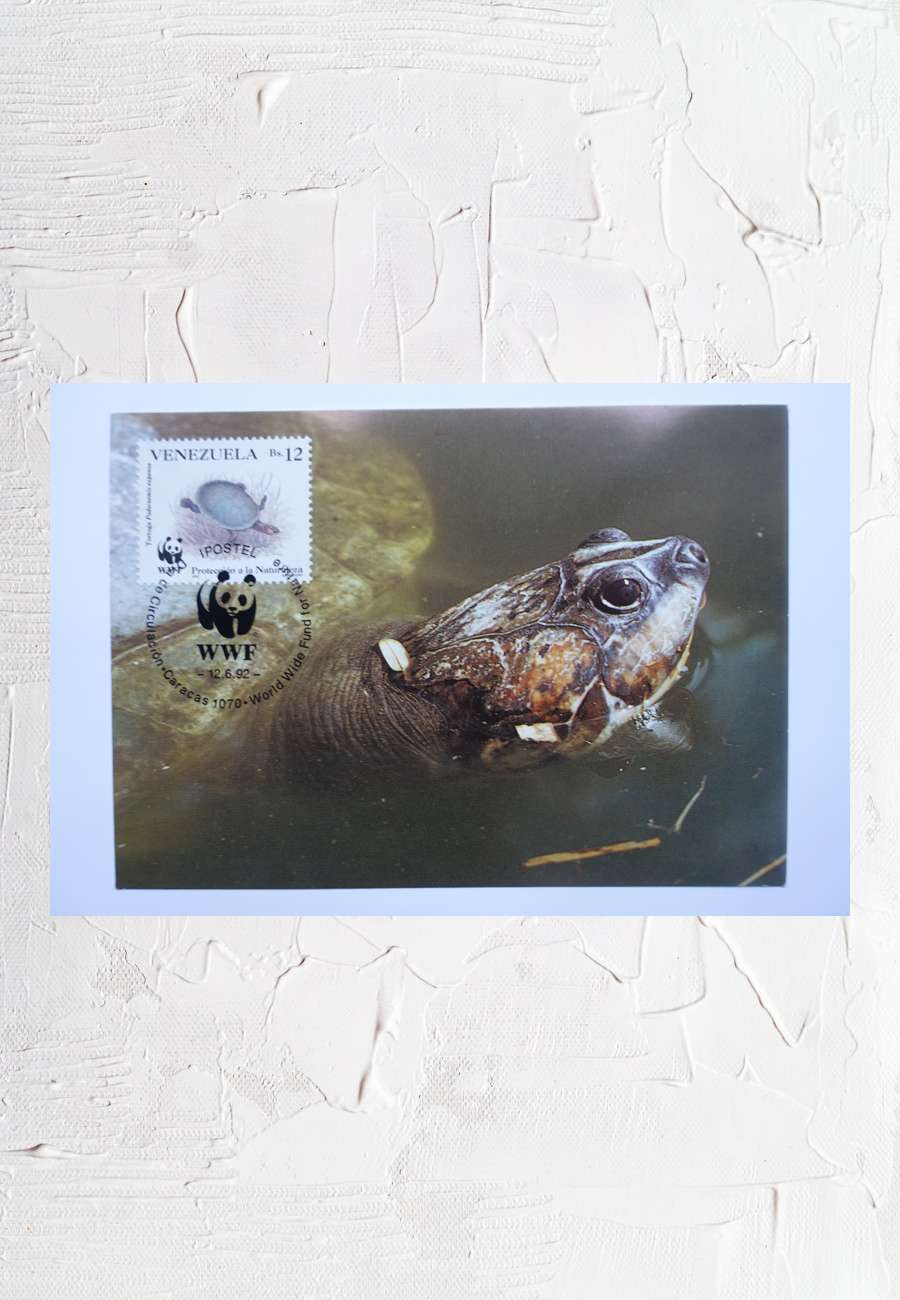 Die Karte mit der originalen Briefmarke aus Venezuela zeigt die Arrauschildkröte. Heimat sind die riesigen Flussgebiete des Amazonas und des Orinokos. Die inzwischen seltenen Schildkröten