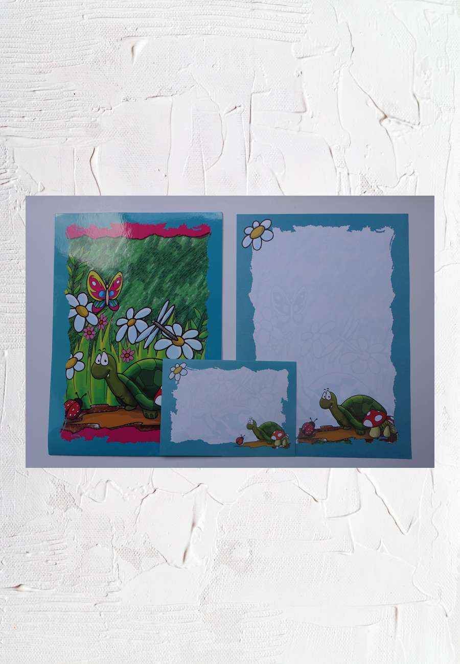 Fröhlich gestaltetes Briefpapier für Kinder, 10 Bogen, mit Kuverts, Fa. Rheita, Kastellaun (Fachhandel für Bürobedarf). Die Firma führt u.a. "Kladden", neutrale Geschäftsbücher, wie sie auch für meine Sammlung verwendet werden.