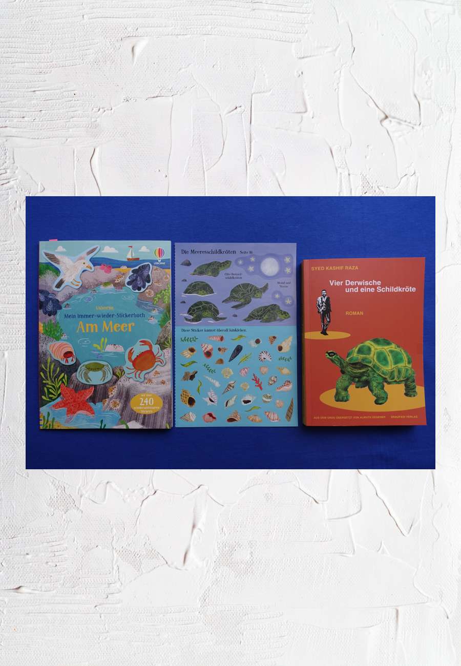 Kinderbuch mit über 240 wiederablösbaren Stickern, Text Jessica Greenwell, Illustrationen Stephanie Fizer Coleman, Usborne Verlag, Großbritannien (mit deutscher Niederlassung in Regensburg, 6. Auflage, 2024). Daneben die Sticker zum Thema Meeresschildkröten. Rechts: Roman, Draupadi Verlag, Heidelberg (2024), Coverbild von Julia Khorrami, 282 Seiten. Das Buch nimmt uns mit in ein Pakistan, das so ganz anders aussieht als das, was oft in den Medien gezeigt wird und erinnert an ein bekanntes indisches Märchen mit dem englischen Titel "The Tale of the Four Dervishes".