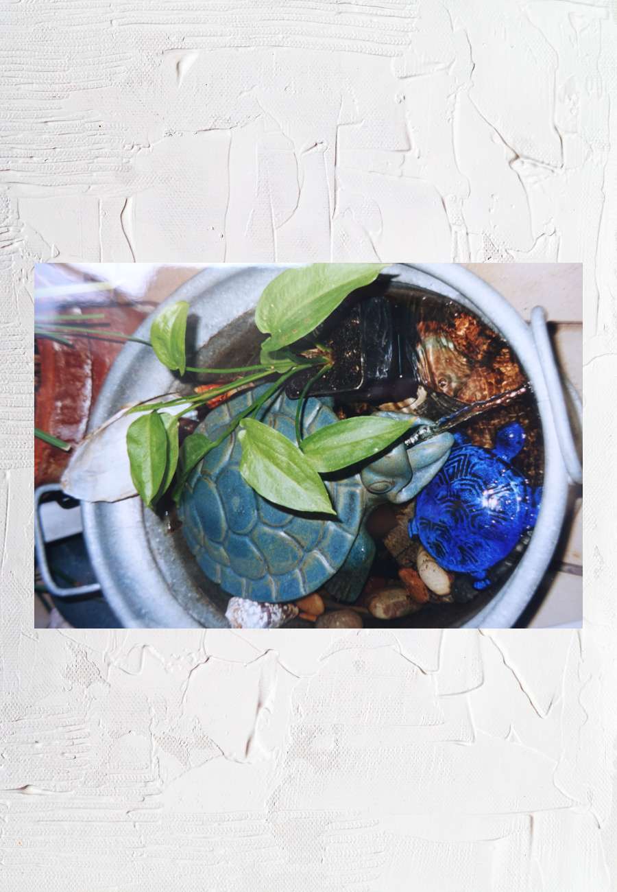 Vor Jahren in einer ovalen Zinkwanne (Größe 55 cm) angelegter, kleiner Springbrunnen, der sich auf dem Balkon befindet. Die linke Schildkröte ist an eine kleine Pumpe angeschlossen, um Wasser zu spucken.