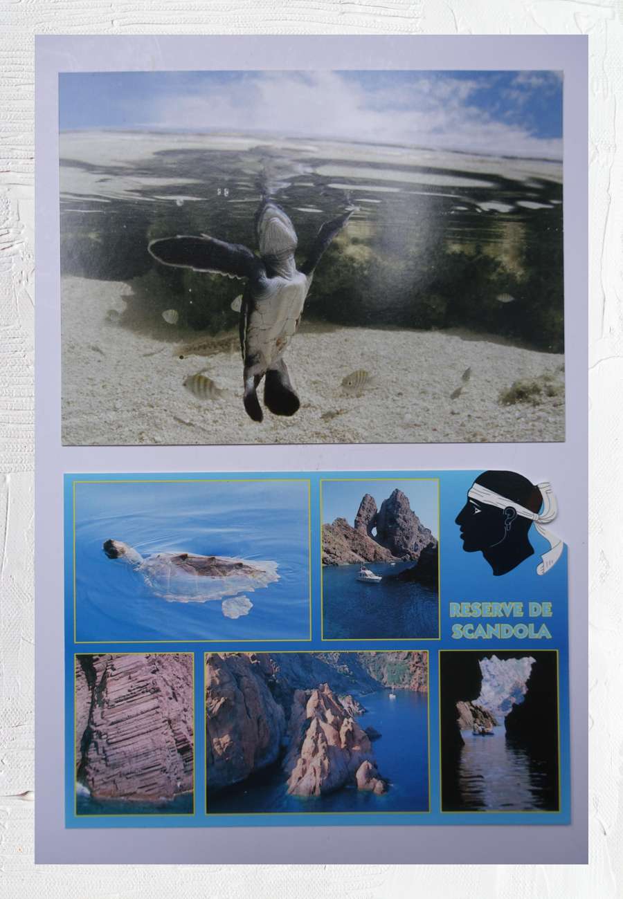 Neuere Karten mit Schildkröten-Motiven von Korsika (Frankreich). Auf der Insel gibt es zwei sehenswerte Schildkrötenfarmen. Die kleinere "Le Village des Tortues" befindet sich im Asco-Tal, die größere "A Cupulatta" ungefähr bei Ajaccio. Dort sind ca. 150 Schildkrötenarten in natürlichen Gehegen zu sehen, auch Riesenschildkröten von den Seychellen und Galapagos-Inseln. Ein Highlight ist die eigene Aufzuchtstation des Parks. Auch auf der Nachbarinsel Sardinien gibt es ein Auffang- und Rehabilitationszentrum: Centro Recupero Animali Marini Asinara (Crama) und das Meeresschutzgebiet Capo Carbonara.