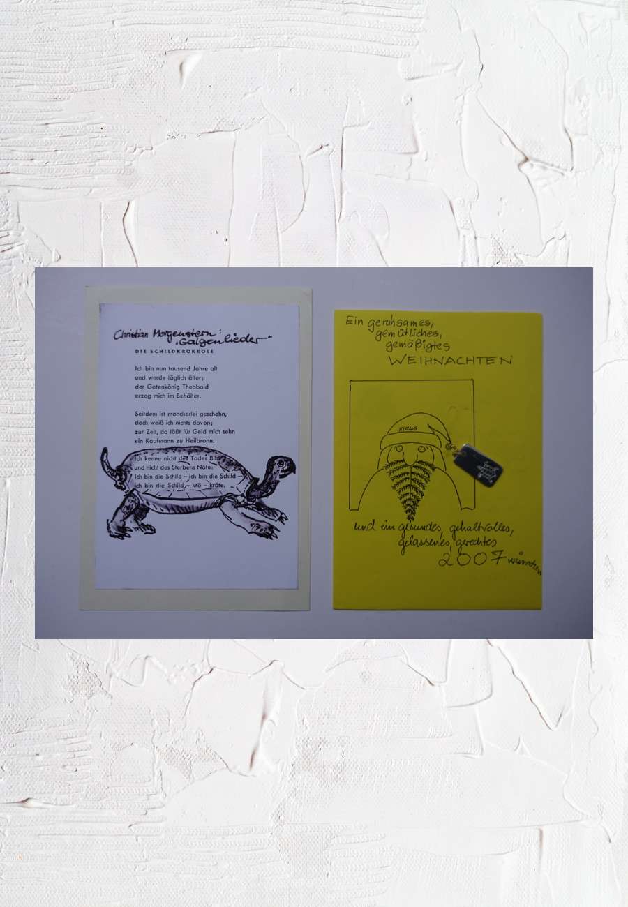 Zwei kreative Tusche-Zeichnungen von Freunden. Links: Illustration von Peter Breth zum passenden Morgenstern-Gedicht. Rechts: Grußkarte von Monika Kanwischer. Deren Nikolaus trägt nicht nur einen Weihnachtsbaum als Bart, sondern hat auch einen kleinen Metall-Anhänger mit eingestanzter Schildkröte an der Zipfelmütze.
