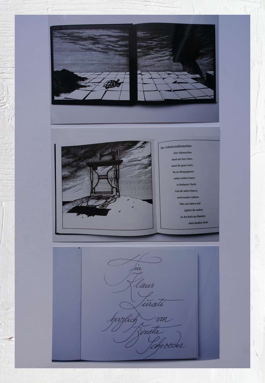Ein seltenes Buch von Michael Ende (1929 - 1995) "Die Schattennähmaschine", Thienemanns Verlag Stuttgart (1982), kongenial illustriert von Binette Schroeder (1939 - 2022). Die Künstlerin mit Grafikstudium an der Schule für Design in Basel, mit zahlreichen Auszeichnungen und nationalen und internationalen Ausstellungen, zuletzt zu ihrem 80. Geburtstag in der Internationalen Jugendbibliothek München, 2020. Als langjährige Sammlerin hat sie über 4700 Bilderbücher zusammengetragen, die dort im ihr gewidmeten Binette-Schroeder-Kabinett gut aufgehoben sind. Zitat: "Neben dem schieren Habenwollen, das wohl jeden Sammler antreibt, steht für sie die nie versiegende Neugier im Vordergrund" (K. Behrend Lesch). Es ist naheliegend, diesen Anspruch zu teilen.