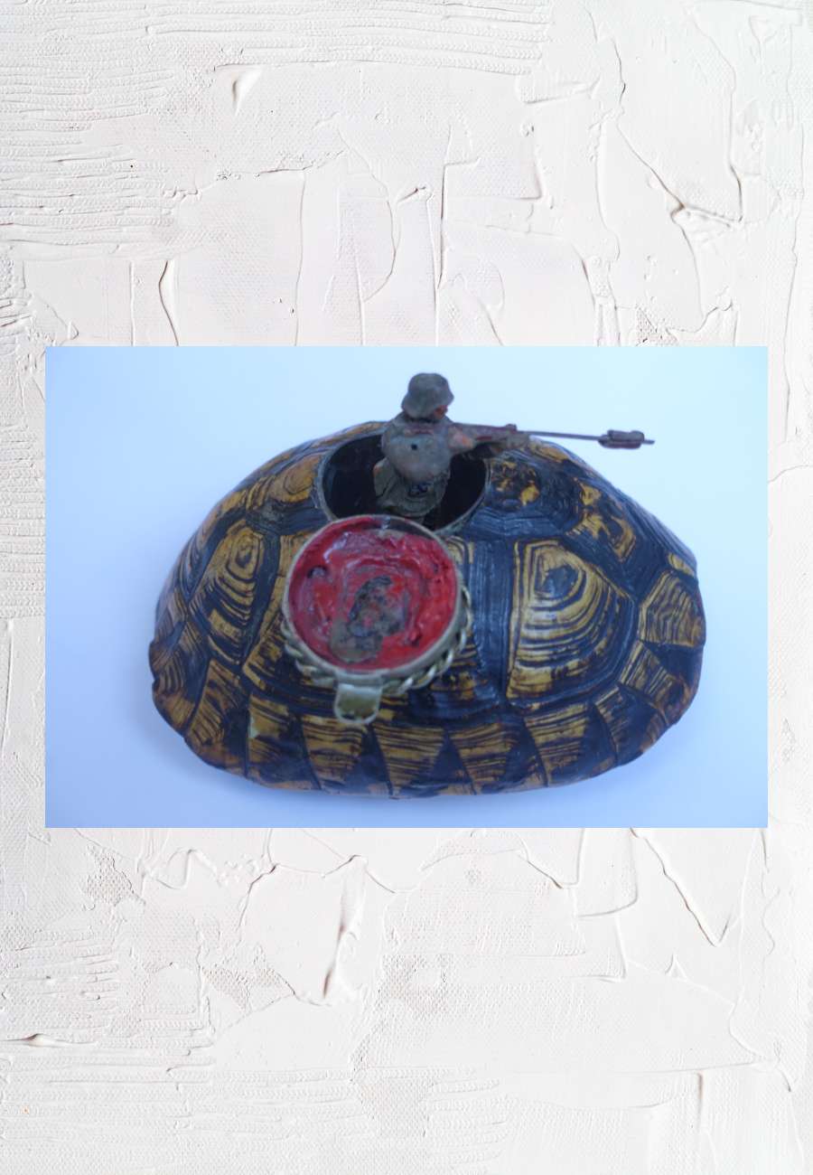 Kompletter Panzer einer Griechischen Landschildkröte (Testudo boettgeri), mit schön ausgeprägtem Muster, in der Bodenplatte ist deutlich ein Schmetterling (s. eigene Seite, "Suche : Schmetterling") wahrnehmbar, Größe 17 cm. Oben wurde ein metallgefasster Deckel mit Scharnier eingelassen. Klappt man diesen auf, ist ein eingebautes Metallgefäß für Siegellack zu sehen, Tiefe 4 cm. Erworben im Antikpalast (München), eine englische Arbeit um 1890. Durch den schlichten Eingriff mit einem Spielzeug-Soldaten (vom Flohmarkt) wird die doppelte Symbolik des "Panzers"