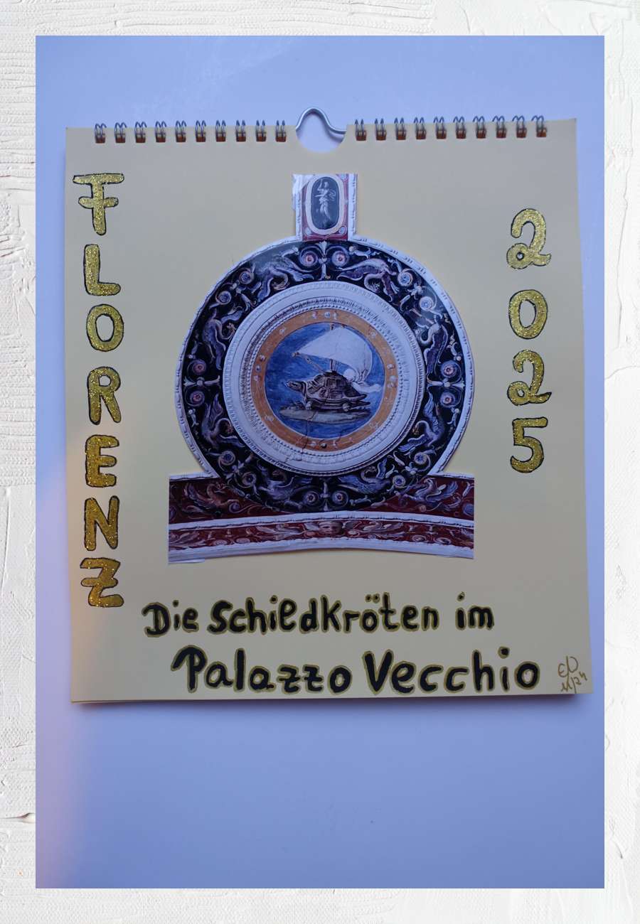 Fotokalender, Format 24 x 21 cm, sign., diesmal konzentrieren sich alle Bilder auf den Palazzo Vecchio in Florenz. Wie auf der Titelseite zeigen viele Fotos eine Schildkröte mit Segel, selbst im Fußboden oder auf Deckengemälden, einmal bewegt sich die Schildkröte erstaunlicherweise auf vier Rädern. Dies geht auf das Motto "Festina lente" (sinngemäß: "Eile mit Weile") des Medici-Herzogs Cosimo für seine Flotte zurück. Dahinter mag sich die Strategie verbergen: greife erst nach sorgfältiger Planung unverzüglich an. Von dem Wandgemälde im "Sala degli Elementi" (Giorgio Vasari) gibt es in meiner Sammlung einen handgemalten Ausschnitt, freskogerecht auf Estrich/Gips (s. Auftragsarbeit Oberdörfer & Nitsch).