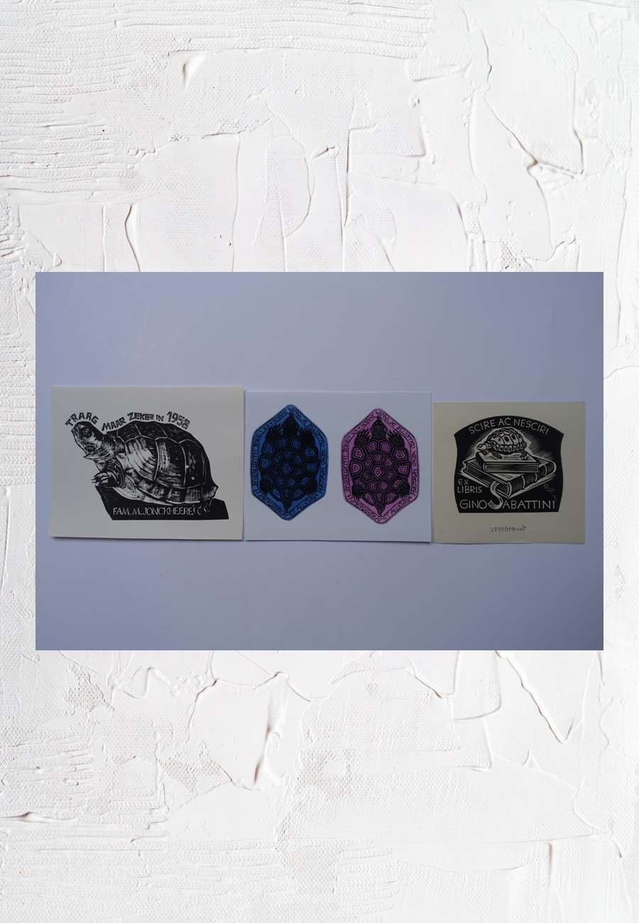 Links: hier begleitet die Schildkröte den Neujahrsgruß der niederländischen Familie Jonckheere, der Künstler ist H. Schelpe (NL). Mitte: dieses Ex libris des Lateinfreundes Dosch gibt es in drei Farbvarianten. Rechts: Ex libris mit Wasserzeichen, der Künstler Wolbrand hat es handsigniert (1947).