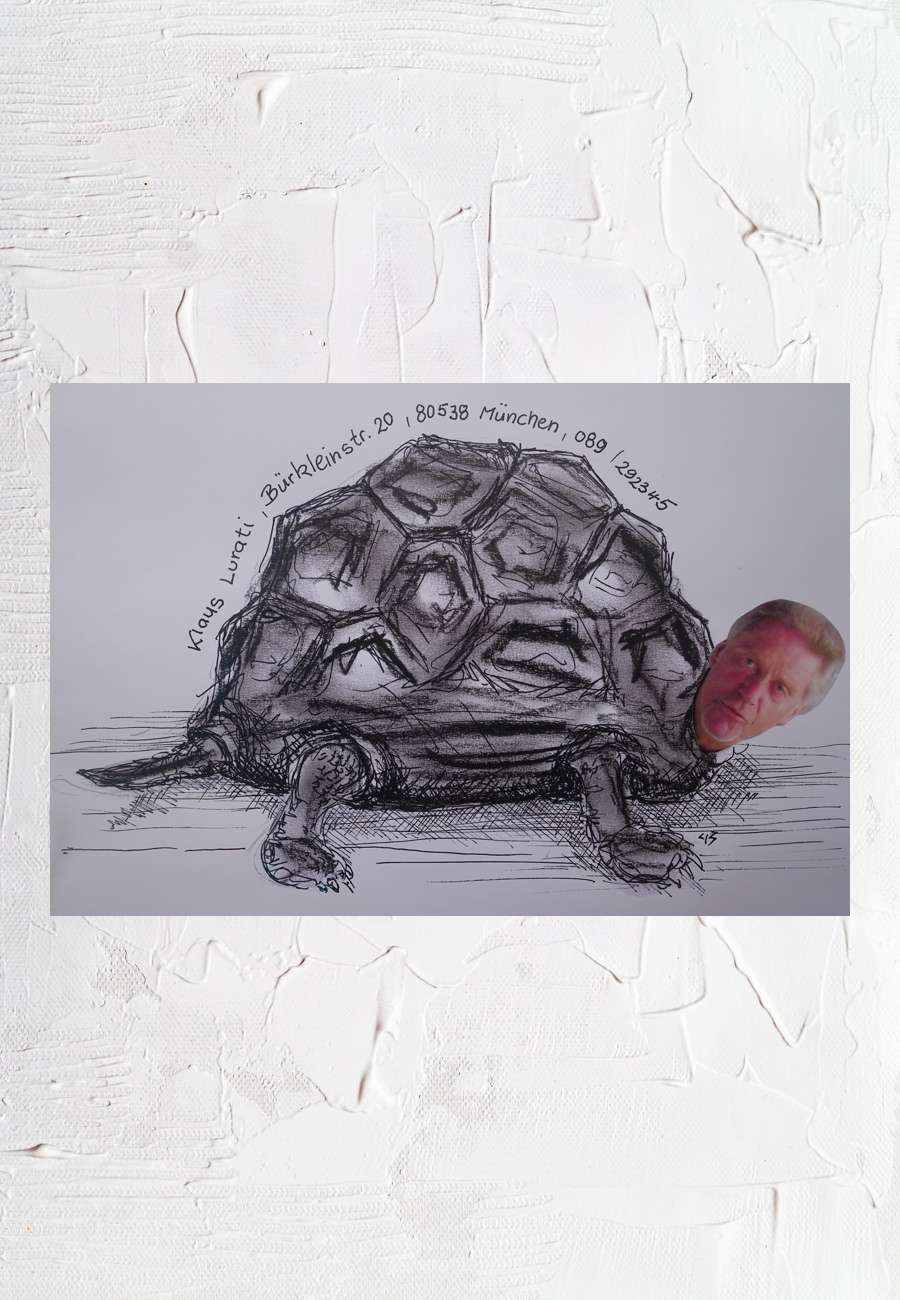 Diese Collage aus Tuschezeichnung und Fotoausschnitt ist 2005 bei der Sommerakademie in Neuburg/Donau spontan entstanden (beim ersten gemeinsamen Bildhauerkurs, geleitet von Hermann Bigelmayr), sign., Format DIN A 4. Seither sind wir befreundet. 20 Jahre später habe ich Peter zu dessen 85. Geburtstag für seine zahlreichen Verdienste um meine Sammlung einen "Verdienst-Orden am Band" überreicht, in Form einer Schildkröte (aus Aluminium, indianisches Design, Größe ca. 12 cm). Sowohl der "Orden" als auch weitere seiner Arbeiten sind unter "Suche: Peter Breth " zu finden.