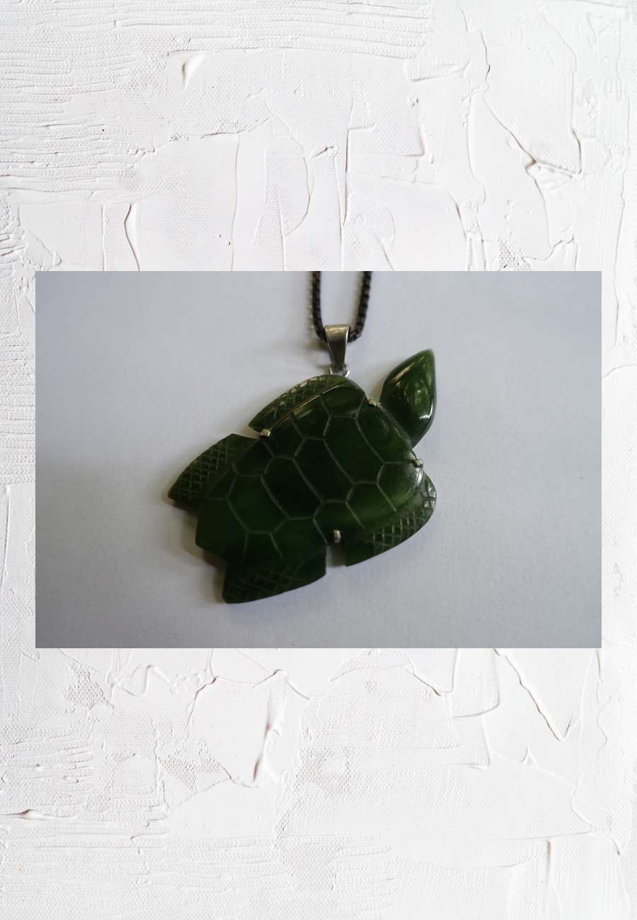 Glückbringender Schmuckanhänge aus China, Volkskunst in zeitgenössischem Design, Jade, an einer längeren, feingliedrigen Kette, rückseitig mit einer Metallfassung, Größe 5 cm. Die ausgeprägten Flossen verweisen auf eine Meeresschildkröte.
