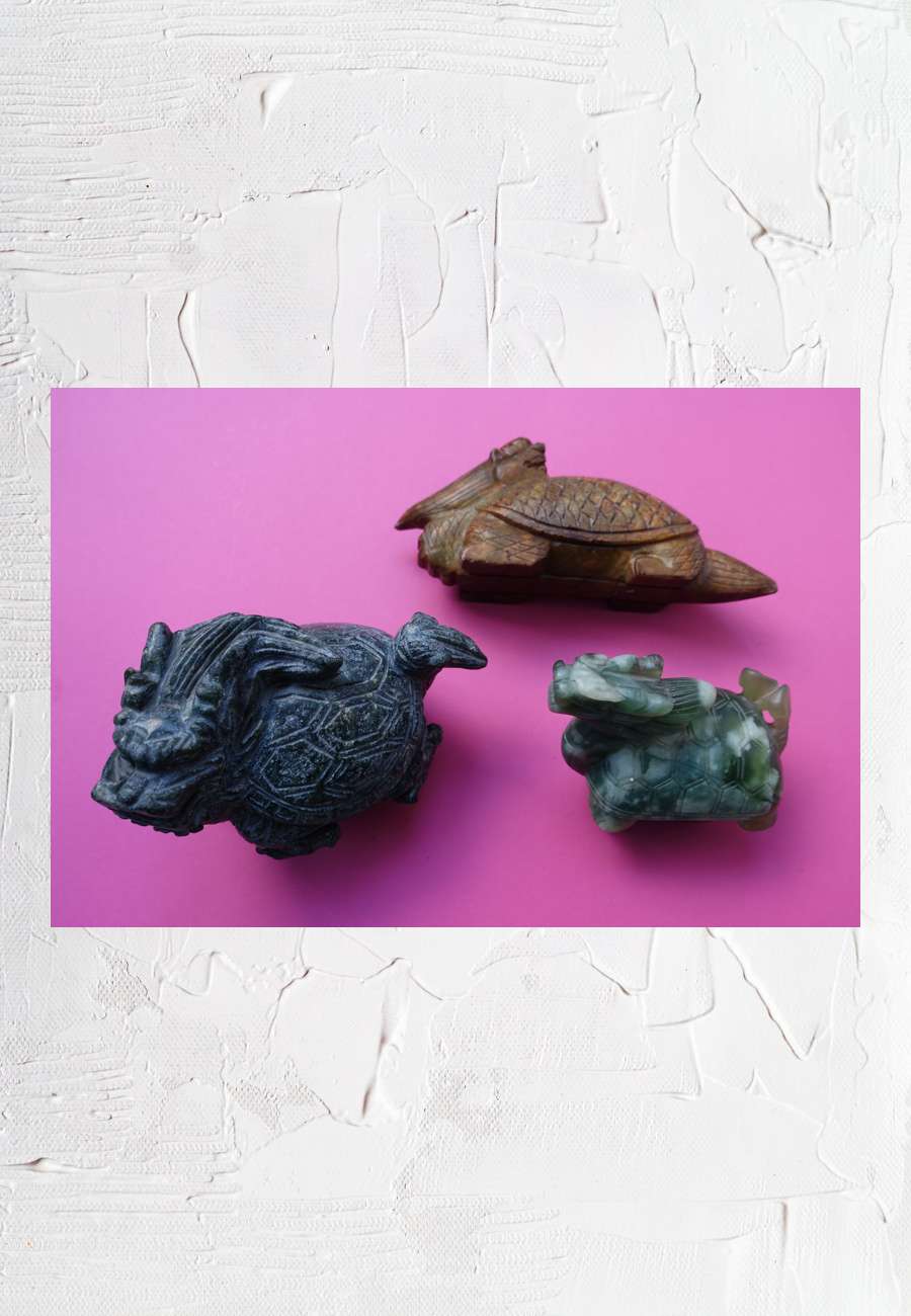 Die interessanten Stücke aus verschiedenen Natursteinen, u.a. Jade, mit symbolischer Bedeutung (Vogel- bzw. Drachenkopf), kommen aus China, übernommen aus der Sammlung Weise.