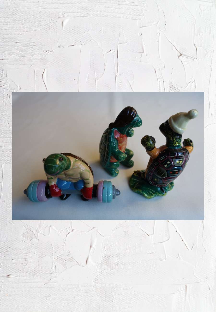 Die poppigen Objekte, bemalt, 9,8 - 12,5 cm hoch, stammen aus USA.