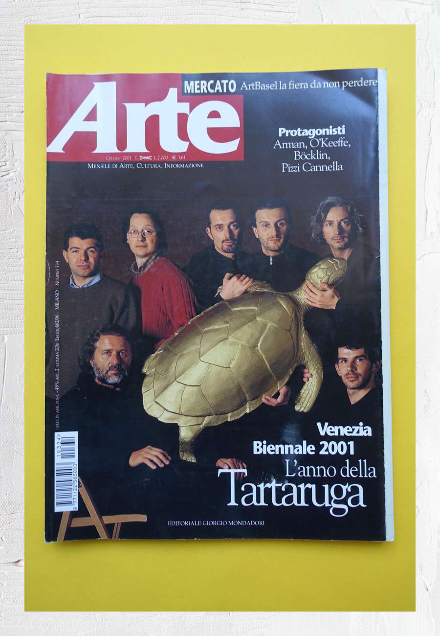 Cover des italienischen Magazins (212 Seiten), zum "Jahr der Schildkröte" (Tartaruga) mit der siebenköpfigen Künstlergruppe "Cracking art" (aus Italien, Frankreich und Belgien, die sich der Umweltverschmutzung widmet). Inhalt ist u.a. ein 10-seitiger Artikel zum Hauptthema, Zitat daraus: "Die Schildkröte ist das perfekte Symbol der Verbindung zwischen Vergangenheit und Zukunft". Kurator der Biennale 2001 war der Schweizer Ausstellungsmacher Harald Szeemann (er war auch Leiter der Documenta 5 in Kassel, 1972). Zusätzlich gibt es noch einen Katalog (159 Seiten), ebenfalls mit einer goldenen Meeresschildkröte auf dem Cover. Insgesamt wurden 1.350 goldfarbene Exemplare aus recyceltem Kunststoff präsentiert (ein Teil davon mit einer kleinen Schildkröte auf dem Rückenpanzer - zu deuten als Zeichen der Hoffnung), Format 44 x 29 x 13 cm. Weitere Hinweise unter "Suche : Tartaruga".