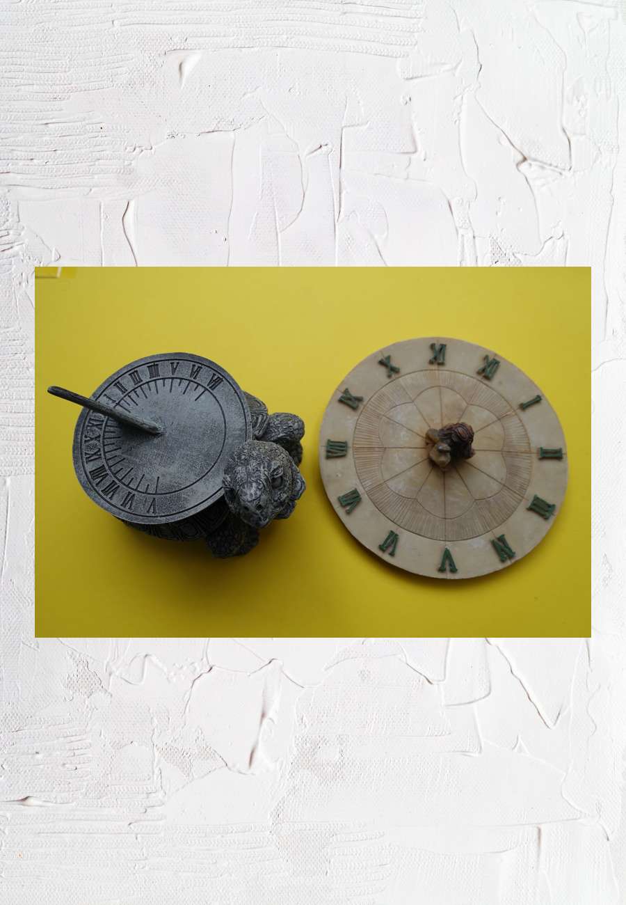 Sonnenuhr, auf dem Rücken einer Schildkröten-Skulptur, United Design Corp. Noble, USA, Größe 14 cm. Außerdem das Ziffernblatt einer Uhr, im Mittelpunkt eine kleine Schildkröte, USA, Durchmesser ca. 16 cm, übernommen aus der Sammlung Weise.