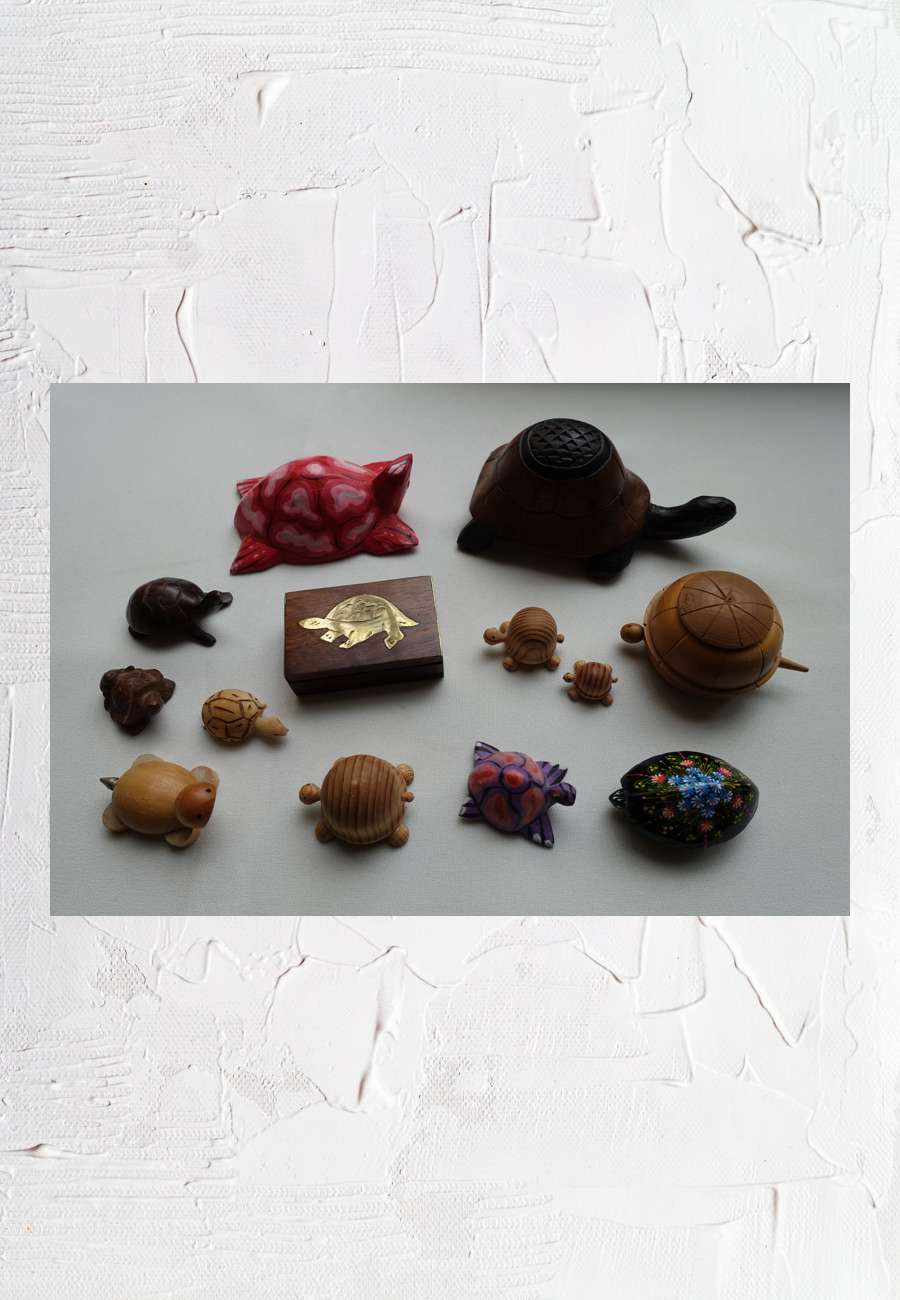Kleine Objekte aus diversen Ländern, zum Teil bemalt, aus unterschiedlichen Holzarten, mittig eine Einlegearbeit (Metall).