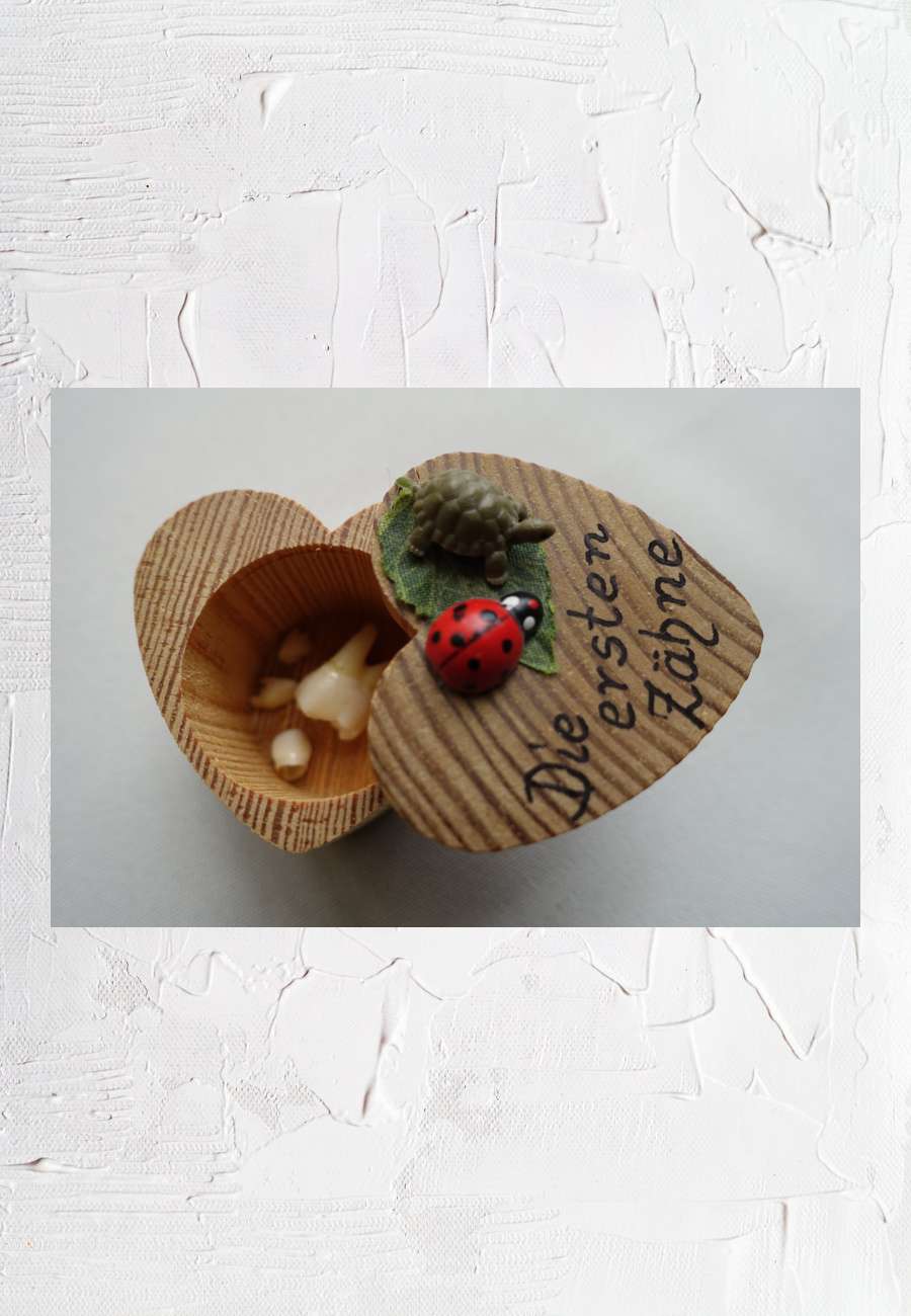 Herzförmige Holzdose, verziert mit Schildkröte und Marienkäfer (kleine Glückssymbole), ca. 4 cm hoch. Inhalt sind erste Milchzähnchen und ein
