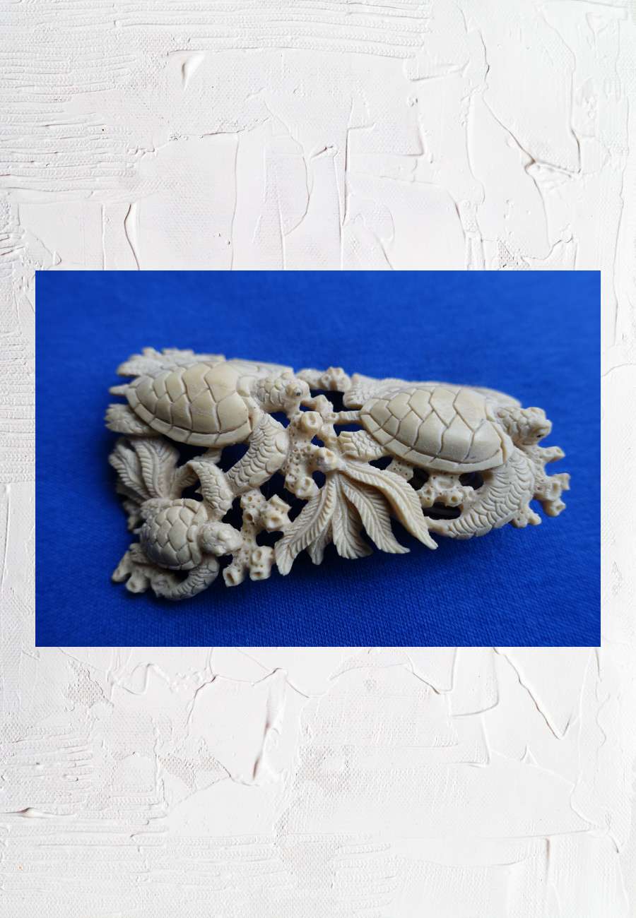 Kunstvolle Handschnitzerei von drei Meeresschildkröten im Korallenriff, aus Hirschhorn, poliert (Rückseite naturbelassen), Größe 8,5 cm, erworben in Salzburg.
