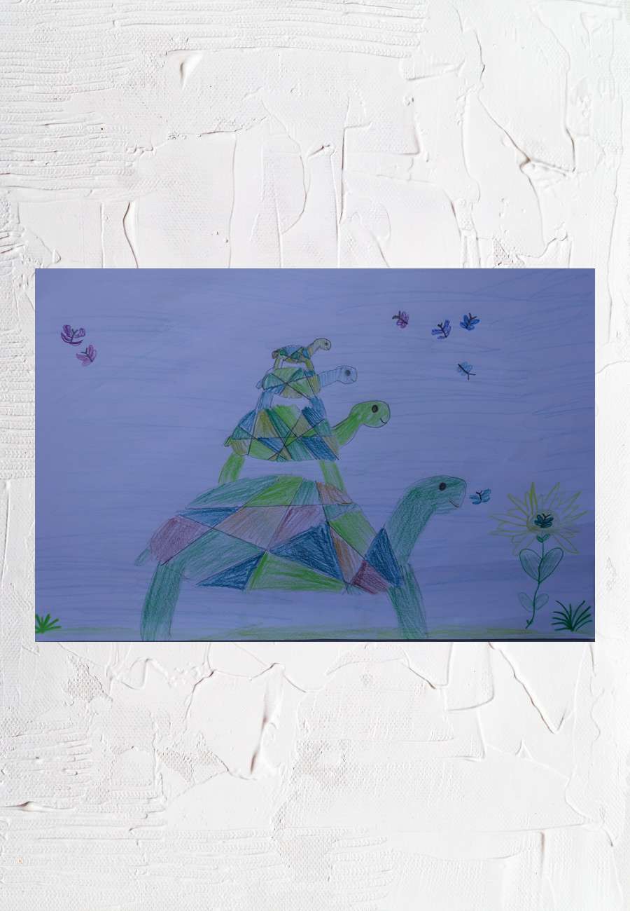 Diese einfallsreiche "Schildkröten-Pyramide" wurde bei einem Besuch in München mit Buntstiften gezeichnet, Format DIN A 4, Alter 9 Jahre.