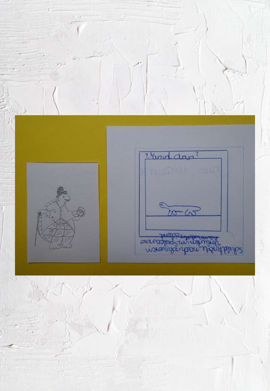 Zwei kleine Zeichnungen, die Motive hat mein Neffe (Alter 12 Jahre) in Kindermagazinen entdeckt und mit Bleistift bzw. Kugelschreiber nachempfunden. Der erstaunliche Text rechts: "Schildkröte nach schweren Verlusten im Spielcasino heimwärts eilend".