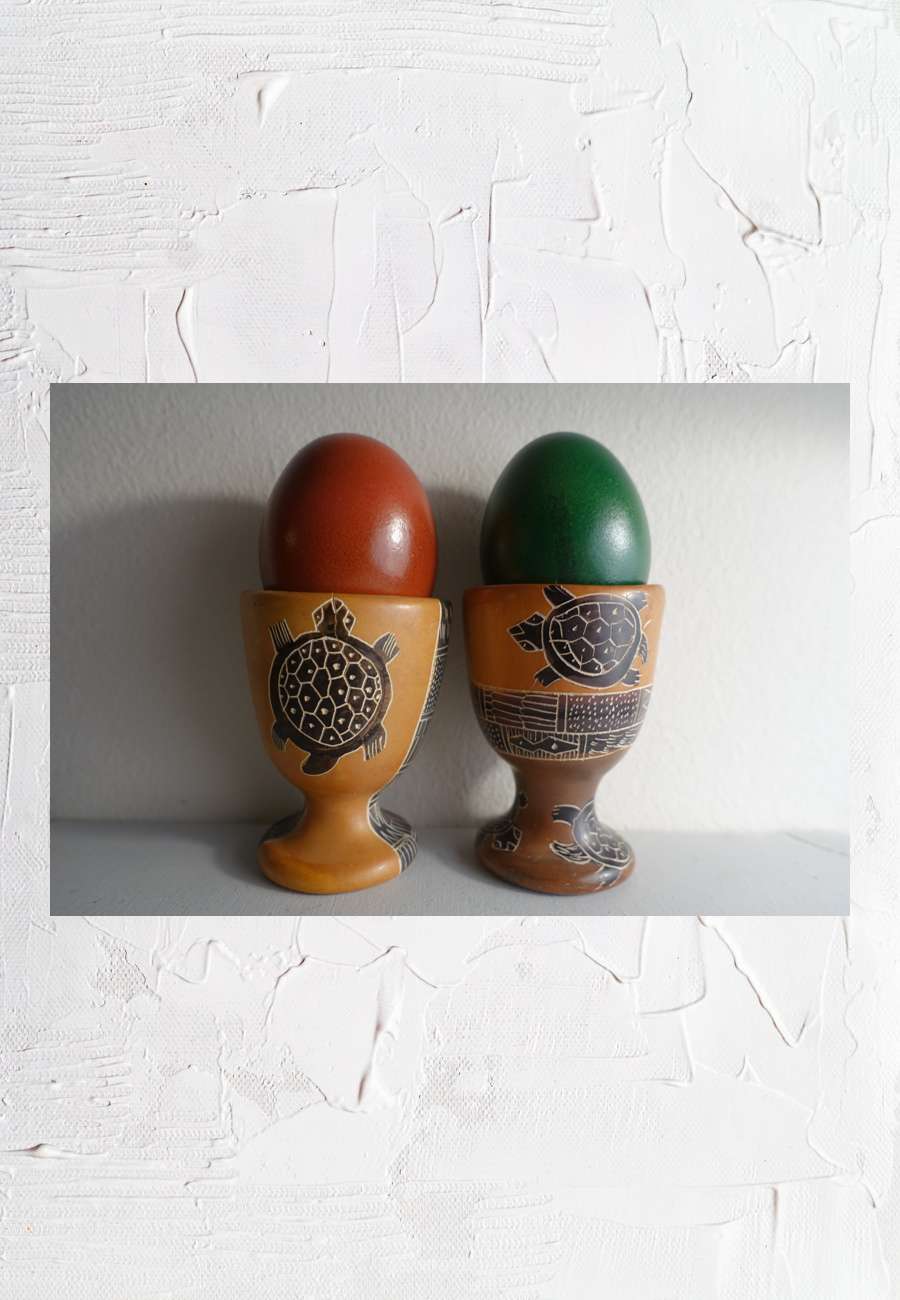 Zwei handgetöpferte Eierbecher (die Motive sind eingekerbt) aus Kenia, mit gefärbten Eiern.
