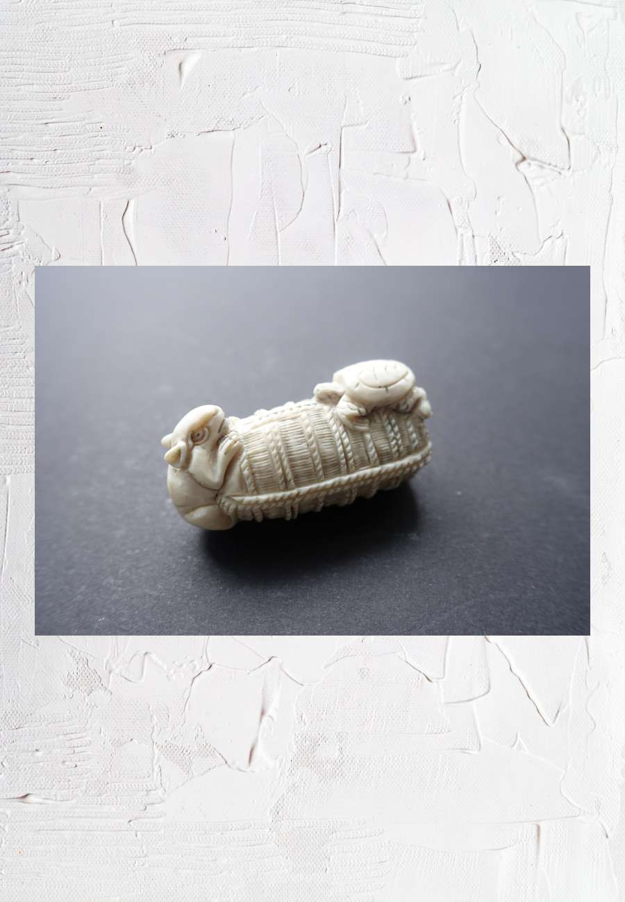 Netsuke, Elfenbein, um 1920, Größe 5,4 cm. Zum Motiv: Ratten sind in der Mythologie Japans oft mit Daikokuten (7 Glücksgötter) verbunden, hier mit dem Gott des Reichtums. Sie gelten als seine Begleiter, weil sie dort auftauchen, wo es reiches Essen gibt (Symbol für Überfluß). Die Schildkröte steht für Weisheit und langes Leben. Die Tiere sitzen auf einem Bienenkorb. Bienen werden wegen der wichtigen Bestäubung und der Honigproduktion verehrt. Weitere dieser kleinen Objekte sind unter "Suche : Netsuke" zu finden.