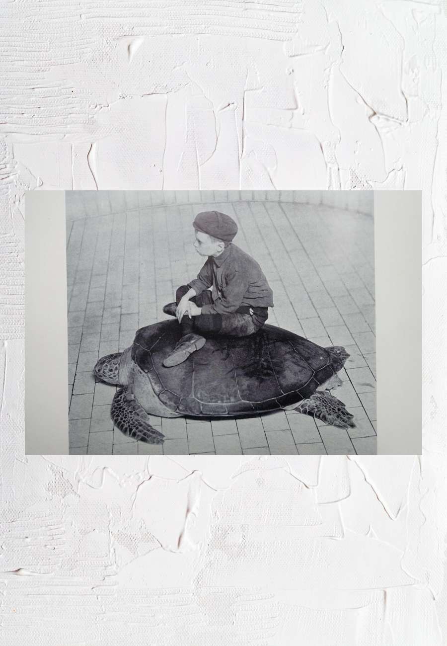Foto der New York Zoological Society von 1931 (siehe auch deren Magazin). Der Knabe sitzt ziemlich lässig auf einer Meeresschildkröte, in einem Becken ohne Wasser.