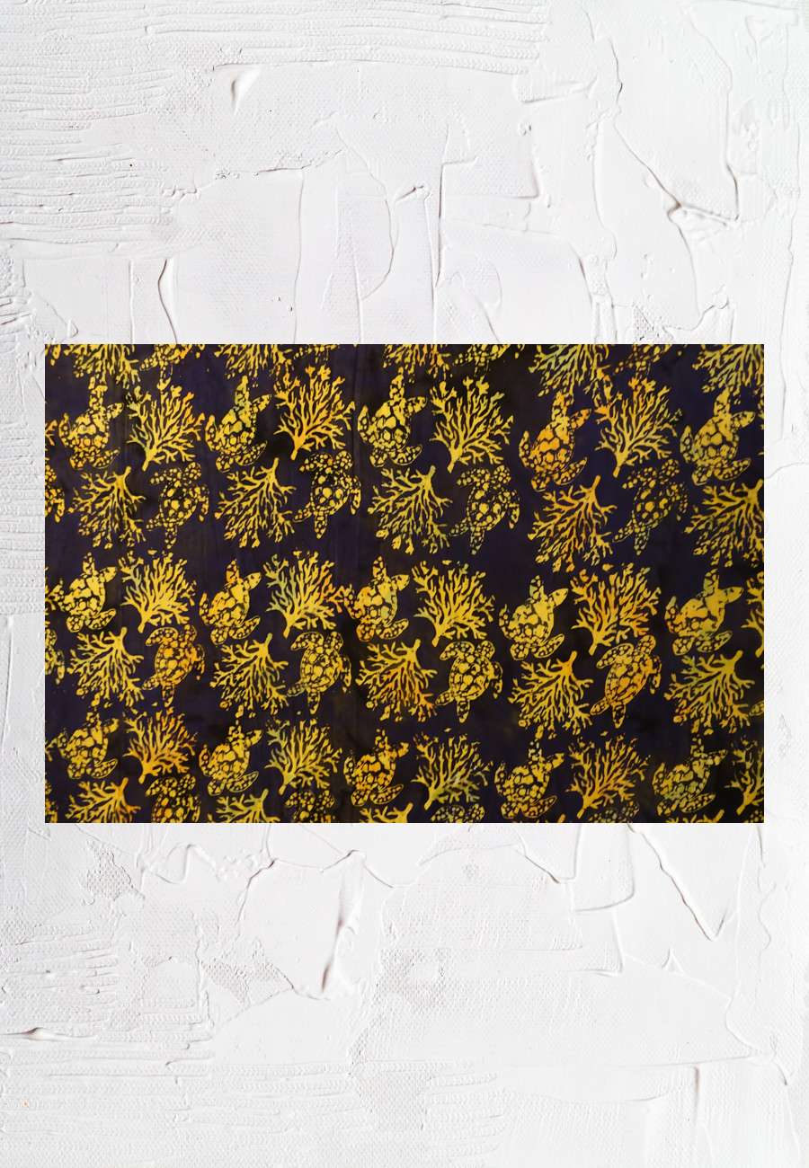 Batik-Sarong (Wickelrock, knöchellang) aus Indonesien. Er besteht aus einer Stoffbahn (Ausschnitt) mit insgesamt 72 Schildkröten-Motiven, 100 % Rayon (Kunstseide), Größe 116 x 162 cm (ohne Fransen). Dieses Bekleidungsstück wird dort vornehmlich von Männern getragen. Da der Stoff sehr leicht und gut faltbar ist, wird er bei uns im Sommer beim baden zum abtrocknen, als Decke oder Sonnenschutz benutzt.