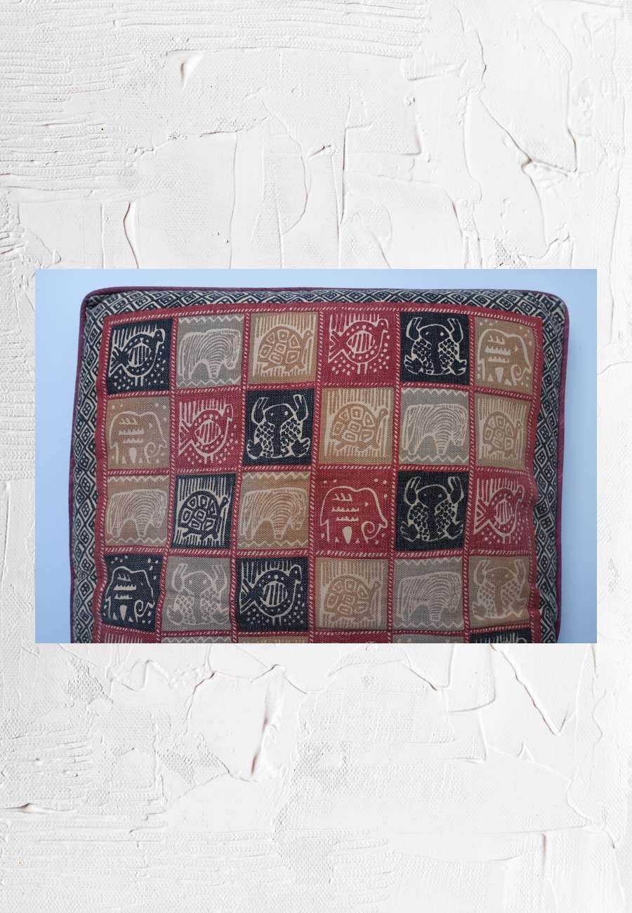 Kissenbezug (Ausschnitt), aus 100 % Zimbabwean Cotton, Fa. Kudhina, made in Zimbabwe, mit verschiedenen Tiermotiven, darunter sieben Schildkröten, Größe 38 x 38 cm.