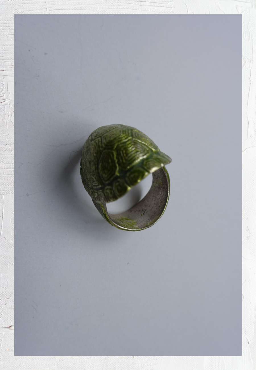 Fingerring mit einem naturalistisch eingeprägtem Schildkrötenpanzer (Größe 3 cm), Messing, ein Zufallsfund im kleinen Laden des "Museum Fünf Kontinente", München.