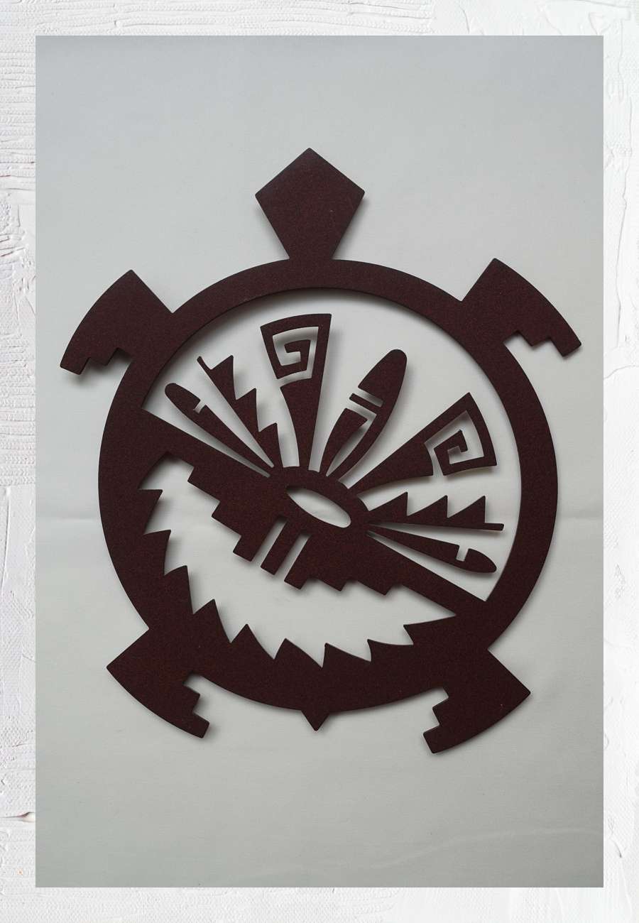 Flache Eisenplatte in zeitgenössischem Design, New Mexico, Größe 38 cm. Die Navajo sind das zweitgrößte indigene Volk der USA, konnten viele Traditionen weitgehend bewahren und sind als gute Kunsthandwerker bekannt. Die Schildkröte gehört in ihrer Ethnie zu den überlieferten Gottheiten und ist Symbol für Mutter Erde, Weisheit, Langlebigkeit und Schutz.