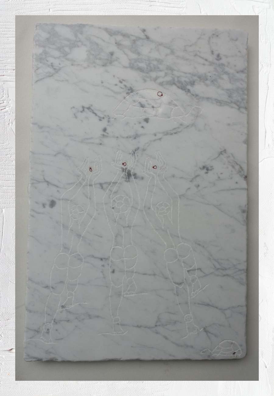 Auftragsarbeit (2025), Marmorbild, Titel "Steinskizze IV", sign., Maße 38 x 25 x 2 cm, mit 5 kleinen Kringeln aus rotem Draht. Die Künstlerin lebt in Regensburg und kommt aus der Bildhauer- und Puppenspieler-Familie Drescher. Daneben gibt es das Magazin "Stein" (3/2023) mit einem ausführlichen Interview und 7 Fotos. Details werden durch Vergrößerung besser sichtbar.