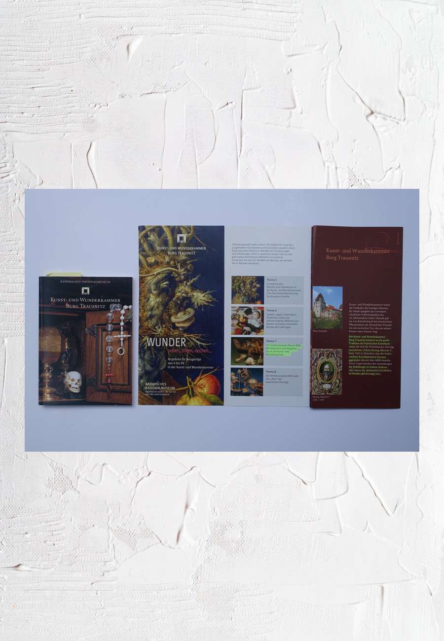 Literatur und Flyer zur Kunst- und Wunderkammer Burg Trausnitz, Landshut (dem Bayerischen Nationalmuseum in München angegliedert), 16. Jahrhundert. Die reiche Sammlung, von den Wittelsbacher Herzögen eingerichtet, wird zeitgemäß präsentiert. Ein Thema ist u.a. die Entdeckung der Neuen Welt und es gibt diverse Schildkröten-Objekte, von der Pulverflasche bis zu präparierten Meeresschildkröten.