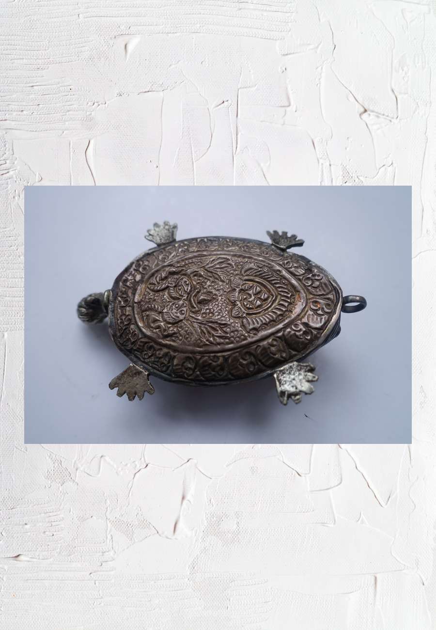 Unterseite eines Döschens aus Tibet, als Anhänger zu tragen, Silber, handwerklich mit Raffinesse ziseliert, Größe ca. 6 cm.