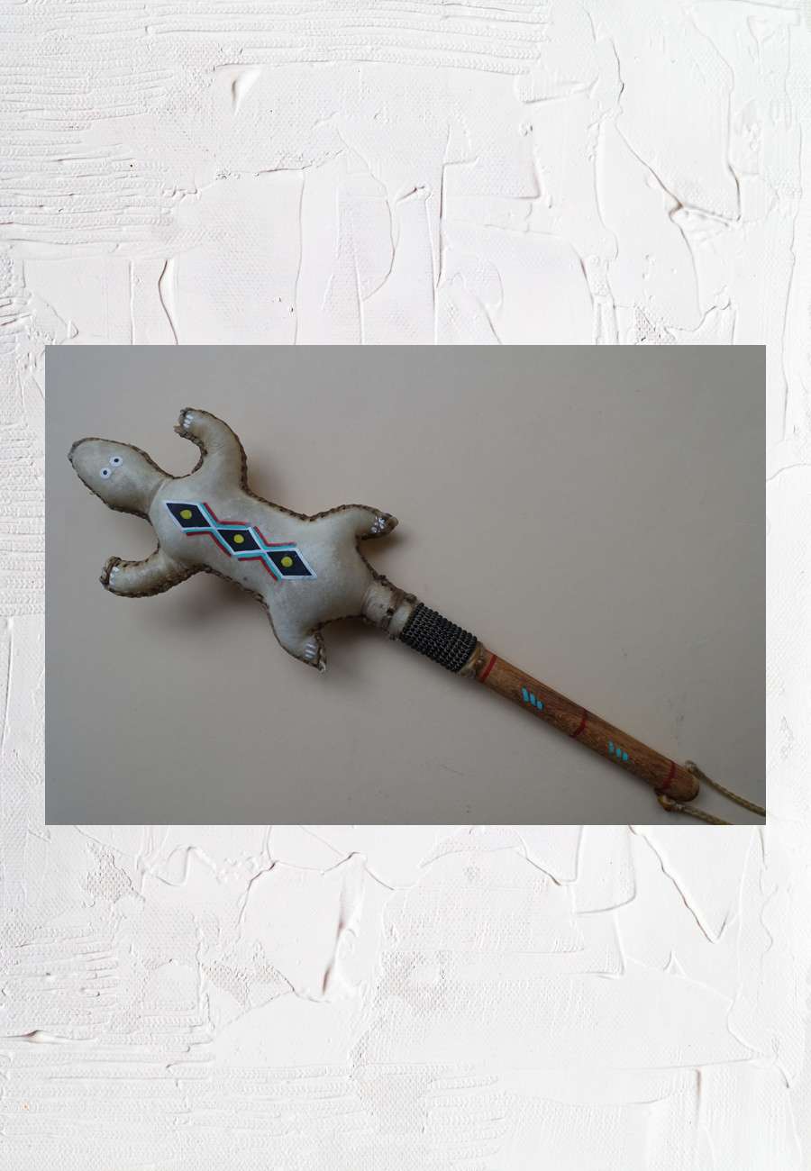 Rassel, Handarbeit der Navajo aus Albuquerque, New Mexico (USA), die Schildkröte ist aus Tierhaut gefertigt, aus zwei Hälften zusammengenäht, mit Körnern gefüllt und bemalt, der Griff aus Holz wurde mit kleinsten Perlen verziert, Größe 33 cm. Vor Ort gibt es bedeutende Kulturstätten wie das "Museum of Natural History and Science, das "Petroglyph National Monument" und das "Indian Pueblo Cultural Center" (dort gibt es eine zeitgenössische Keramikarbeit mit einer Schildkröte, auf der 6 Kinder sitzen).